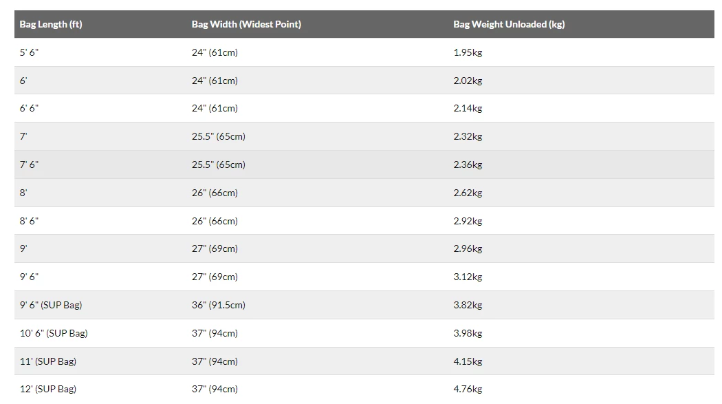 All bags 7′ 6″ and above have a quick-release centre fin opening on the bottom of the bag to accommodate long centre fins without having to remove them from the board. These bags offer a generous fit and are designed for the length of the board they state (e.g. a 7ft bag is designed for an average 7ft board). The width of the bag is maintained in the nose and tail of the bag for wider boards and minimal shapes too. If you are unsure if a bag will fit your board, please refer to the ‘Surfboard Travel Bag Size Guide’ table below for additional info.