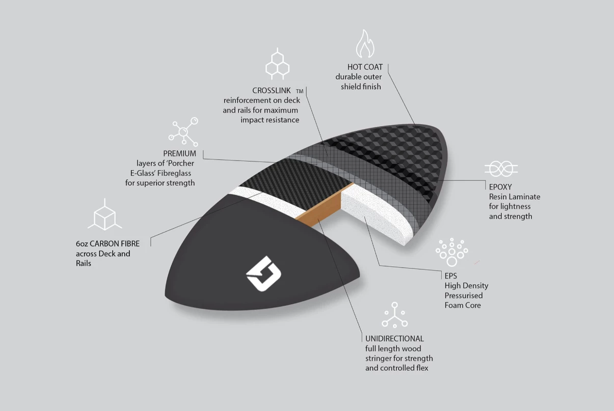- AEROSPACE GRADE 3k 220g/m3 CARBON FIBRE across TOP (DECK) and SIDES (RAILS) for SUPERIOR Construction and REFINED ride