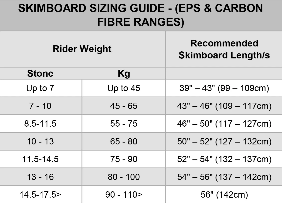 Choosing the right size skimboard can depend on a number of factors: weight, height, physical rider characteristics, experience level and whether you want to mainly pull tricks or ride a wave. The general rule is you need enough flotation to hold your weight and get you out to the deeper water of the shorebreak. At Circle One, they have used their years of experience and knowledge of skimboarding to put together a Skimboard Size Grid (in images) that will help you choose the right board.