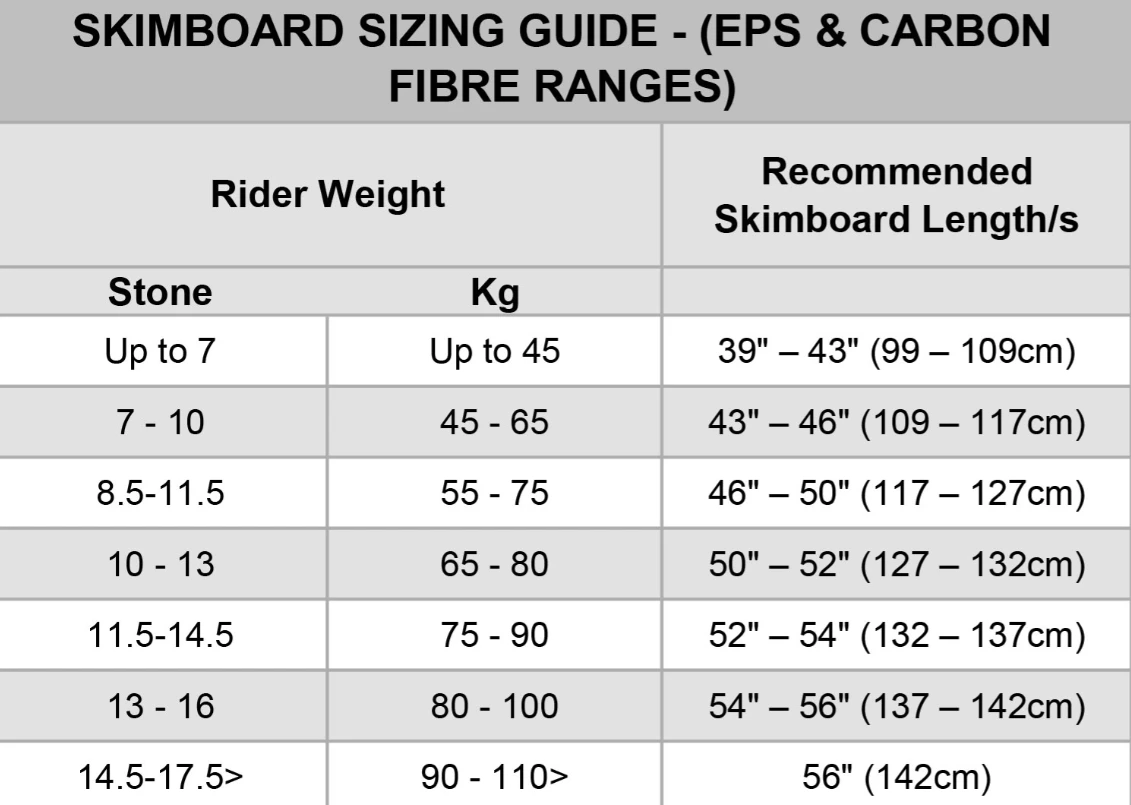 Choosing the right size skimboard can depend on a number of factors: weight, height, physical rider characteristics, experience level and whether you want to mainly pull tricks or prefer to ride a wave. The general rule is that you need enough flotation to hold your weight and get you out to the deeper water of the shore break.