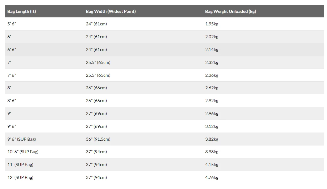 Circle One Surfboard Bags and SUP bags are a generous fit and designed for the size of the board stated, e.g. a 7ft bag is designed for an average 7ft surfboard. The width is maintained in the nose and tail of the bag to account for mal shapes and wider boards. If you are unsure if a bag will fit your board, please refer to the size guide table below for the exact dimensions and unloaded weight of the bag.