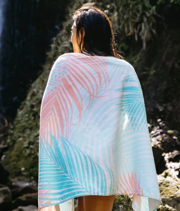 Under the woven shade of a tropical palm tree comes the Hala towel. The artfully designed printed velour front makes this towel the perfect lounging companion. These towels have a non-printed looped terry 460 GSM back that is made for optimal drying and it features a drawcord loop for quick drying and is printed with a reactive dye that prevents fading over time. It is made from 100% sustainably sourced cotton and is perfect for the beach, pool, lake, hot springs or wherever your adventures take you.